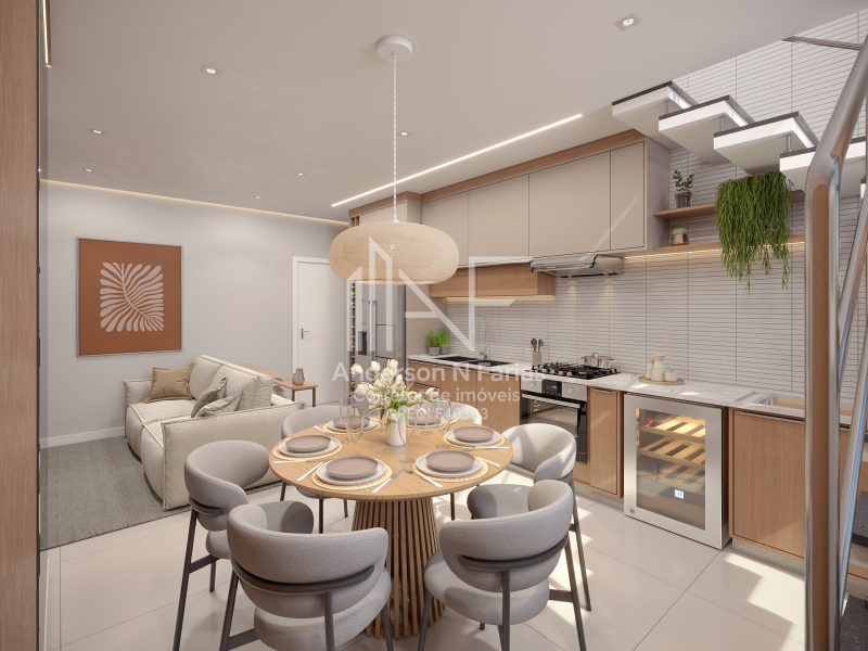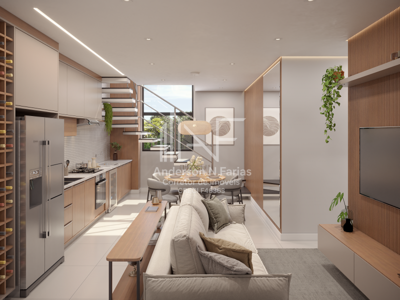 Cobertura duplex encantadora A APENAS 1 QUADRA DO MAR com 2 quartos (sendo1 suíte), cozinha integrada e banheiro social no piso inferior.