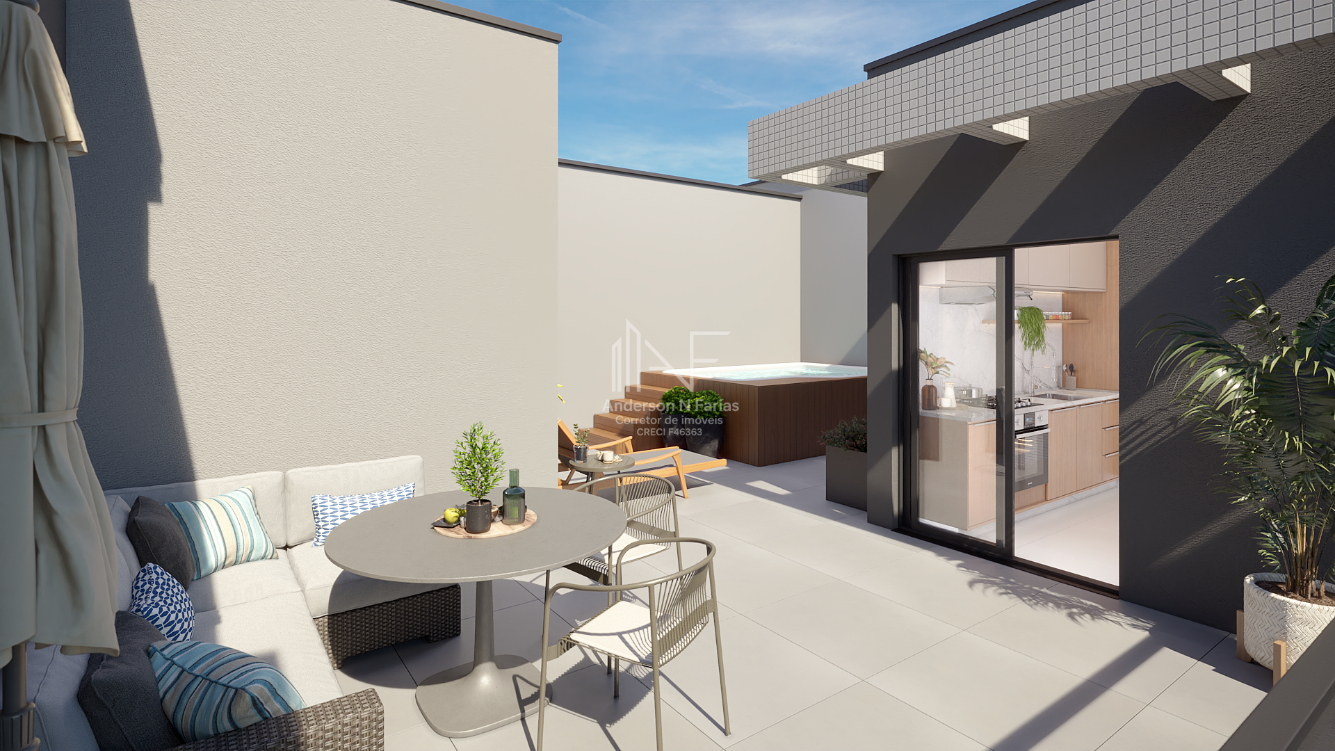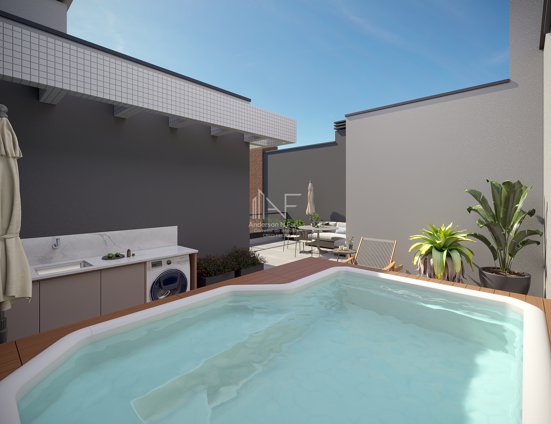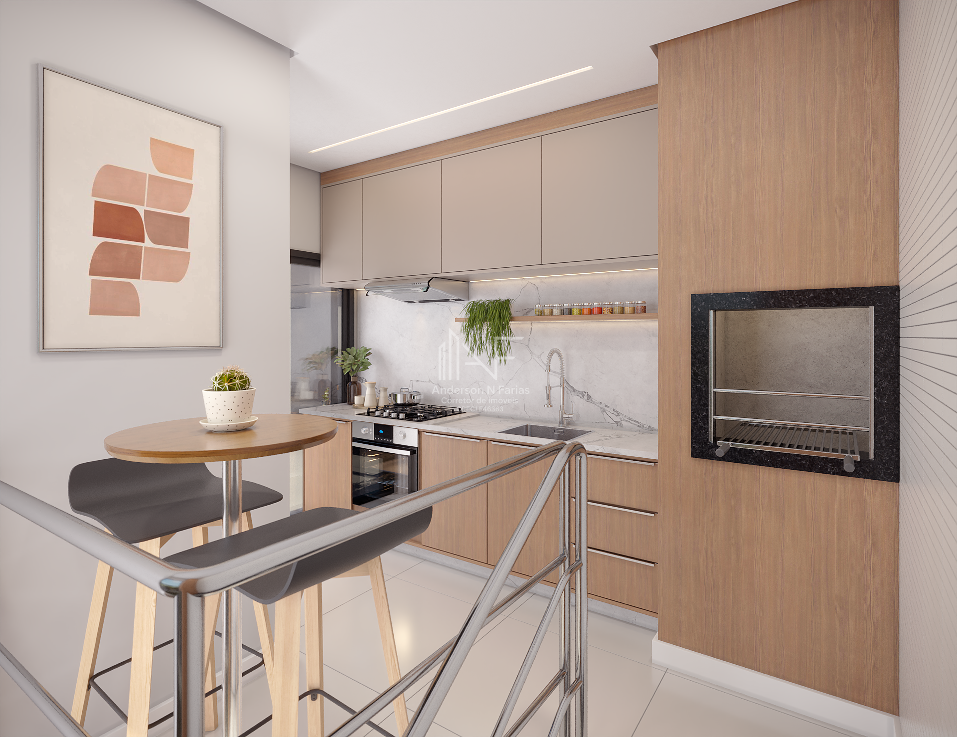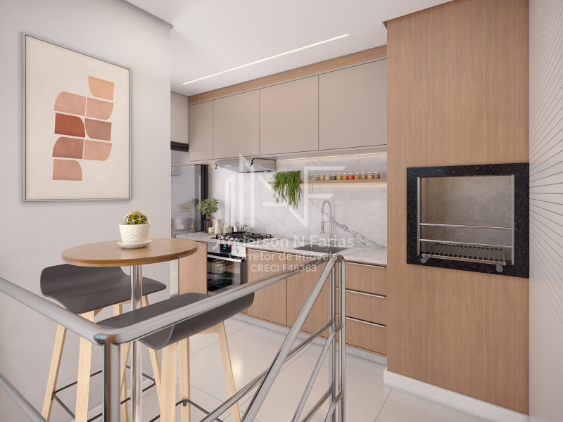 No superior, um espaço gourmet com churrasqueira e terraço privativo, perfeito para reunir amigos e familiares.